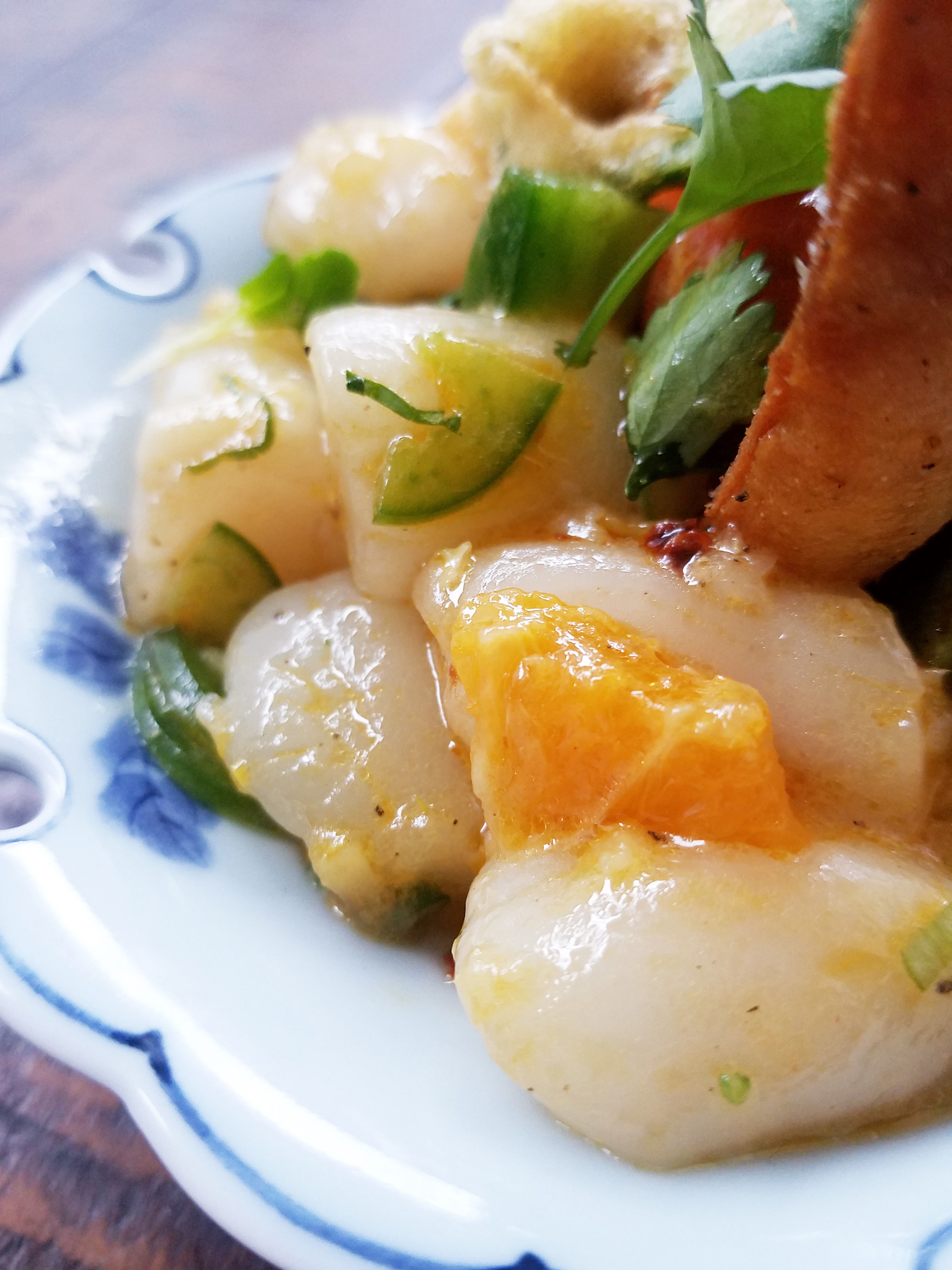 Bristol Bay Scallops are a great addition to any menu. They are plump and have a firm flesh. I really enjoy preparing them in raw applications, like ceviche. It’s a great time of the year to do ceviche with the plethora of citrus and tropical fruits that are available. I simply marinate the Scallops in Santa Ines Extra Virgin Olive Oil, meyer lemon juice and zest, a little crushed chili flake, coriander stem, and salt and pepper, then garnish with pickled kumquats, pomegranate, and lotus chips for a nice crunch. This dish is bright, eye appealing, and palate pleasing. It’s great as a first course or light lunch and sure to please even the pickiest palates.