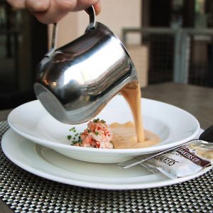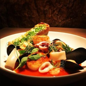 - Poached Barramundi – Seafood risotto, saffron cream, tomato compote.