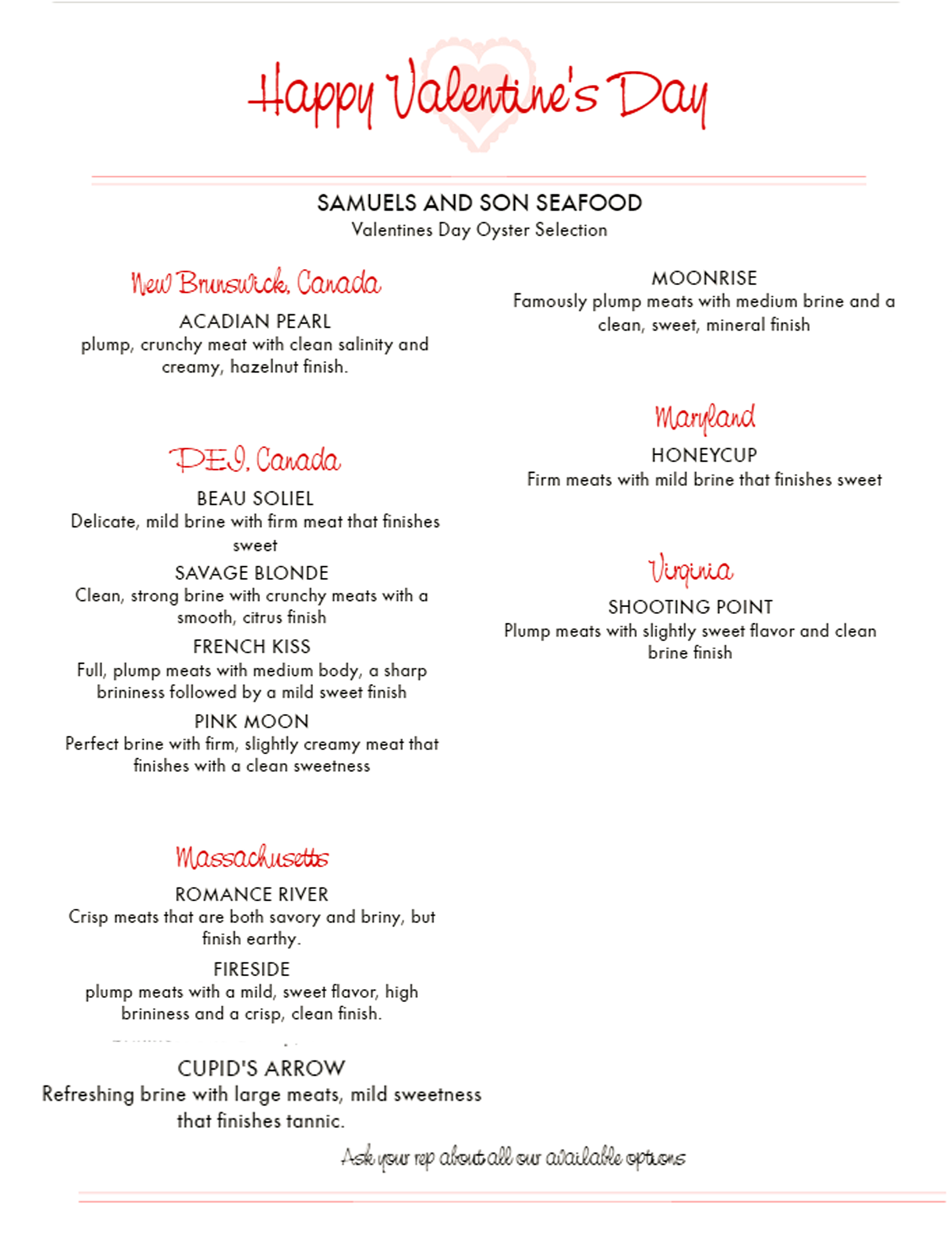 Valentines Day Oyster Menu by Kate Emick | Feb 9, 2018 | Articles, Fish Tales® Network, Uncategorized Check out a list of our Featured Holiday Oyster Selection here -> vday menu