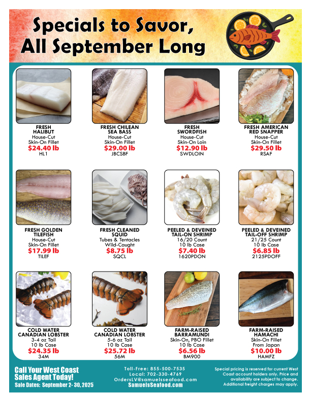 Check out our quarterly specials, you never know what you might find. Every quarter we feature fresh and frozen seafood, as well as other items to round out your menu. From appetizers to entrees to condiments, we tried to think of everything. Contact your sales representative to place an order.